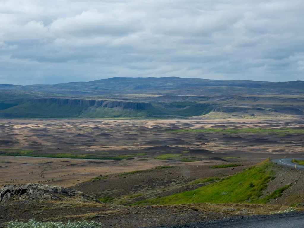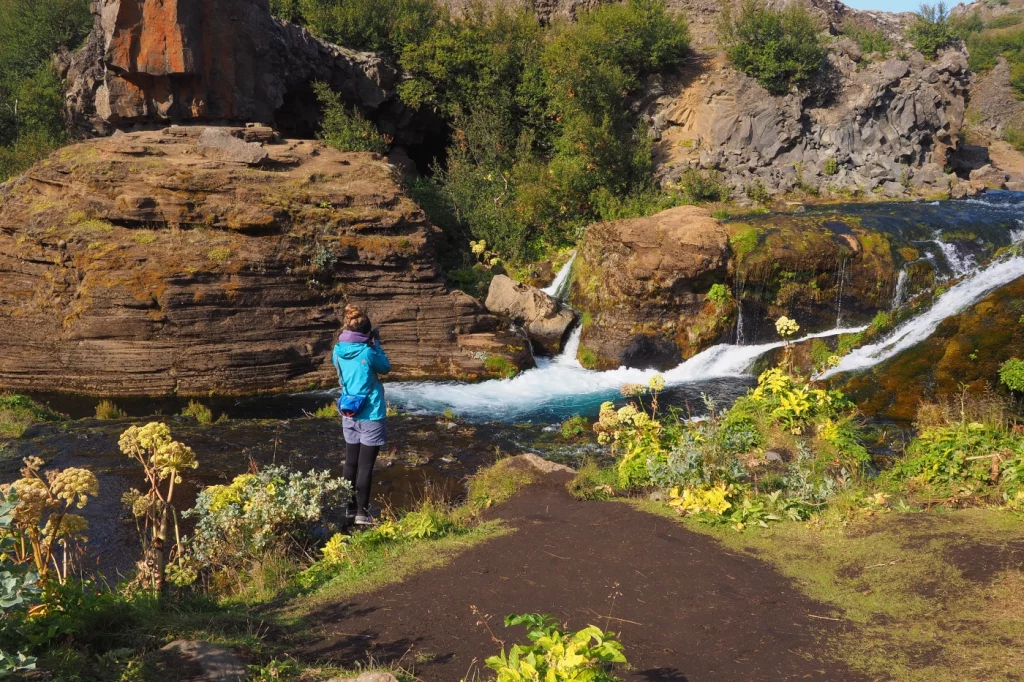 Heute ist Wasserfall-Tag. Wir fahren über immer kleiner werdende Straßen zum Abzweig einer Piste zu dem Gebiet Gjáin. Da man dort nur mit Geländewagen fahren kann, stellen wir unser Auto ab und spazieren ca 1h durch wüstenartige Dünenlandschaft die Piste entlang. Links ist die Hekla, das erklärt die viele Lava und die wenige Vegetation. Das Wetter wird besser und wir kriegen Sonne. „Hier soll irgendwo Wasser sein??“ Denken wir uns.
