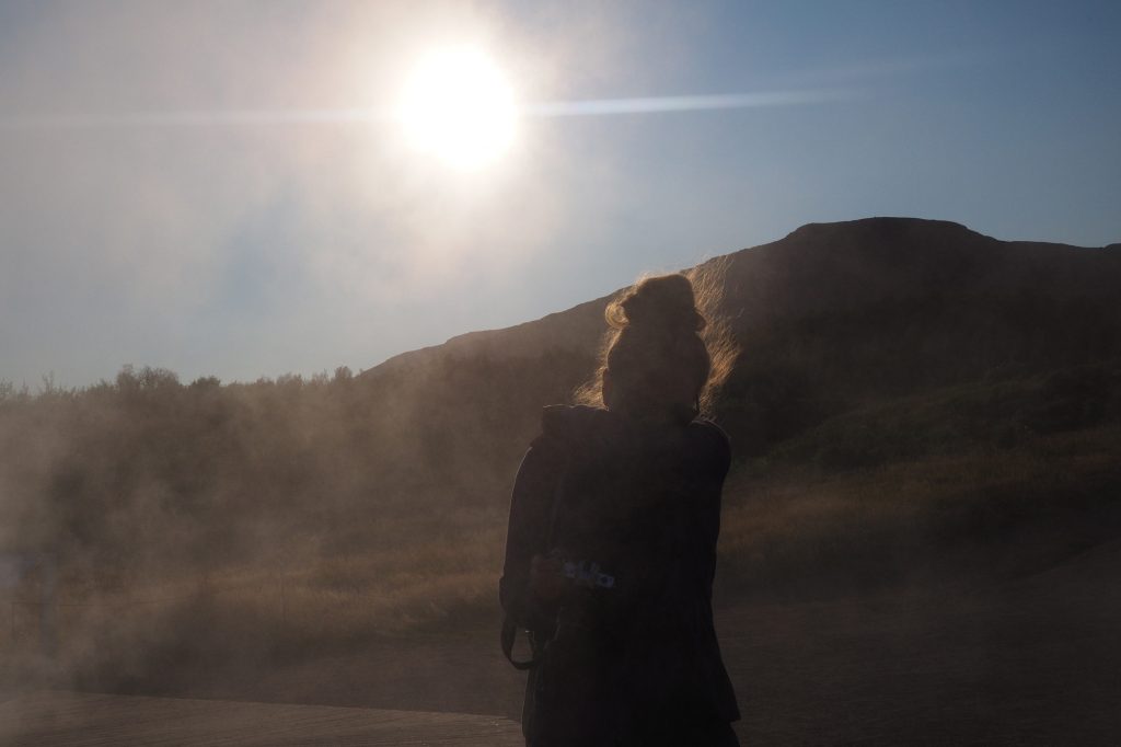 Wir warten gespannt bis er ausbricht, es dauert gefühlt ewig. Ich beobachte einen Mann, der mit dem Rücken zum Geysir steht und ein Selfie-Video macht. Sachen gibts… Und endlich bricht er aus! Eine kleine 3-Meter-Fontäne schießt nach oben und stürzt in sich zusammen. Der Selfie-Mann packt sein Handy ein und geht. Ich schiele zu Michi. Das wars jetzt? Dafür ist der Geysir so berühmt? Wegen so einem kleinen Spucker? Gerade will ich ansetzen etwas zu sagen, da explodiert der Geysir auf einmal wieder. Ewig hoch schießt das Wasser in die Luft, bestimmt 30 min! Woah! Wir sind ganz aufgeregt, hatten blöderweise grade unsere Kameras nicht parat. Da bleibt uns nichts anderes übrig, als noch eine Fontäne abzuwarten.