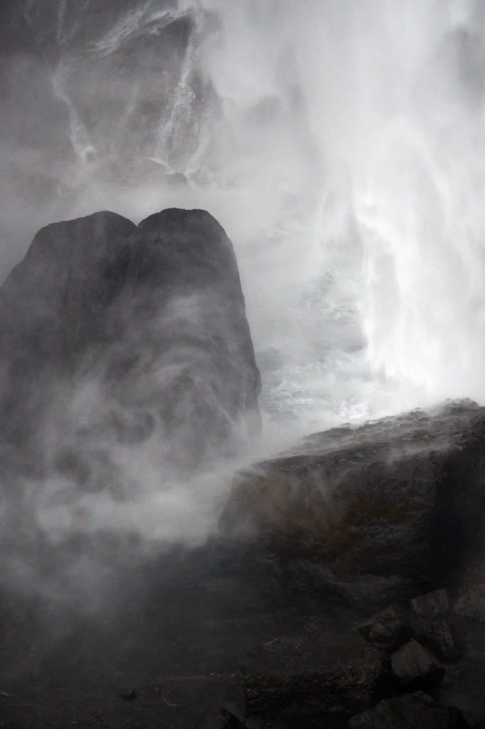 Nach ca 20 min wird die Sicht kaum merklich besser. Es sieht total toll aus, sehr mystisch wie sich die Landschaft langsam immer stärker herausschält. Zuerst kann man nur wenig erahnen, dann kommt immer mehr zum Vorschein. Mir gegenüber ist eine große breite Gletscherzunge die im See endet. Von links schwingt sich eine zweite Gletscherzunge elegant zum See. Wie schön das ist! Was mir bisher verborgen war!