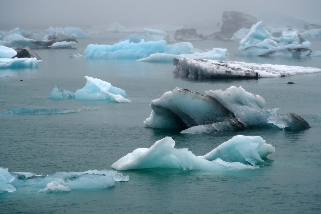 Wir bleiben wegen Regen nur kurz und fahren total nass zum Fjallsárlón ins Restaurant zum trocknen und Kaffee trinken. Ich gehe noch allein zum See, Michi hat genug (und immer noch keine Regenjacke). Man sieht nur ein paar Eisbrocken im Wasser schwimmen, der Rest verschwindet im Nebel. Dann höre ich aus dem weißen Nichts ein lautes Grollen und Rumpeln. Es klingt total imposant und mächtig, wie das Eis außer Sichtweite abbricht.
