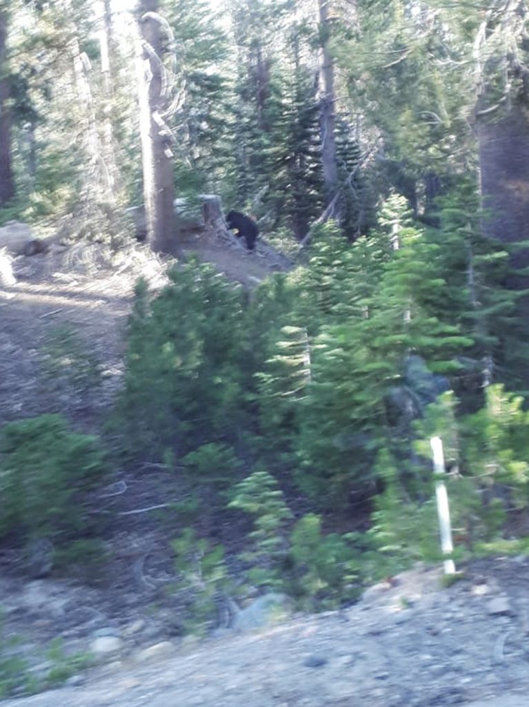 Mel und ich fahren zusammen mit dem Bus von Reds Meadows nach Mammoth Lakes, er ist gesteckt voll mit Tagestouristen. Auf der Fahrt läuft doch tatsächlich ein kleiner Schwarzbär direkt vor dem Bus über die Straße und verschwindet im Wald! Unglaublich, mein erster Bär in freier Wildbahn! Der Busfahrer kündigt den Bär über das Mikrofon an und ein hoher Schrei geht durch den ganzen Bus. Die Menschenmasse drängt nach vorne und nach links zu den Fenstern und alle kreischen gemeinsam. Mel und ich schauen uns entgeistert an. Willkommen in der Zivilisation.