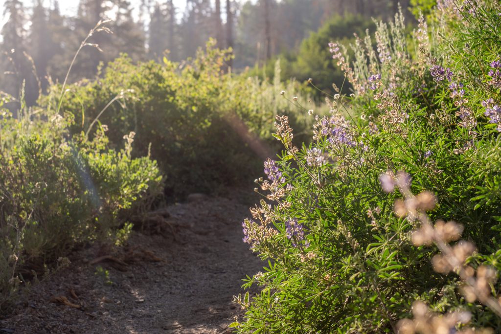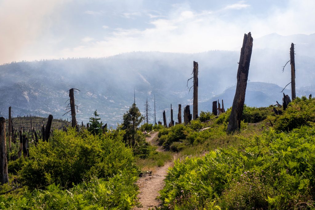 Was ich besonders beeindruckend fand war die Stunde direkt vor Reds Meadows: Man läuft durch ein riesiges, altes Waldbrandgebiet. Es ist wirklich faszinierend, wie lange die Natur braucht, um sich von einem Brand zu erholen. Auf einer großen Fläche ragen die Stümpfe in die Höhe, es haben sich noch keine neuen Bäume angesiedelt (wie das z.B. im Bayerischen Wald auf den geschädigten Flächen von Sturm Kyrill der Fall ist). Nur der Farn und kleinere Büsche tauchen die Hügel in ein sattes Grün und überwuchern teilweise den Trail.