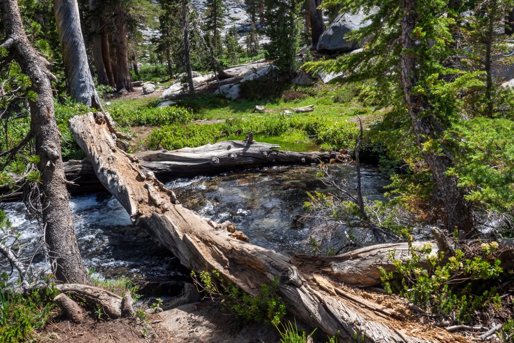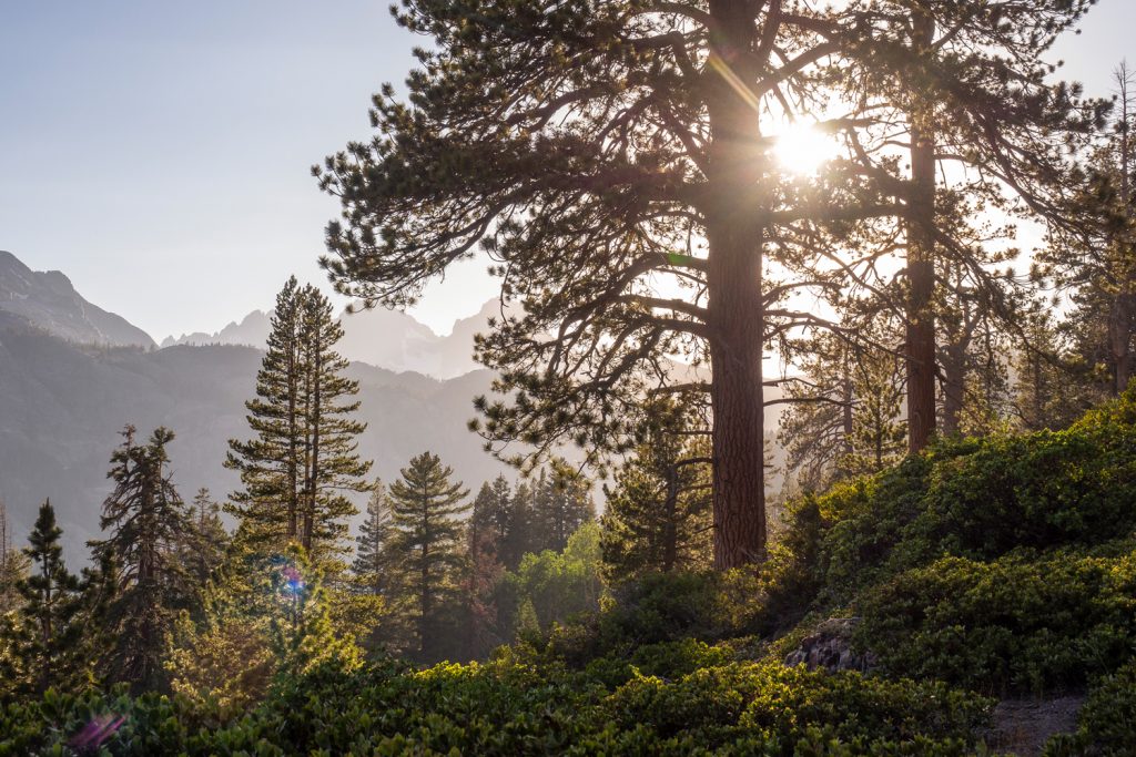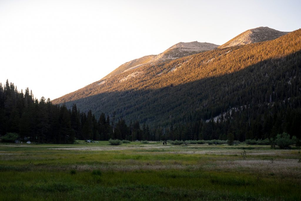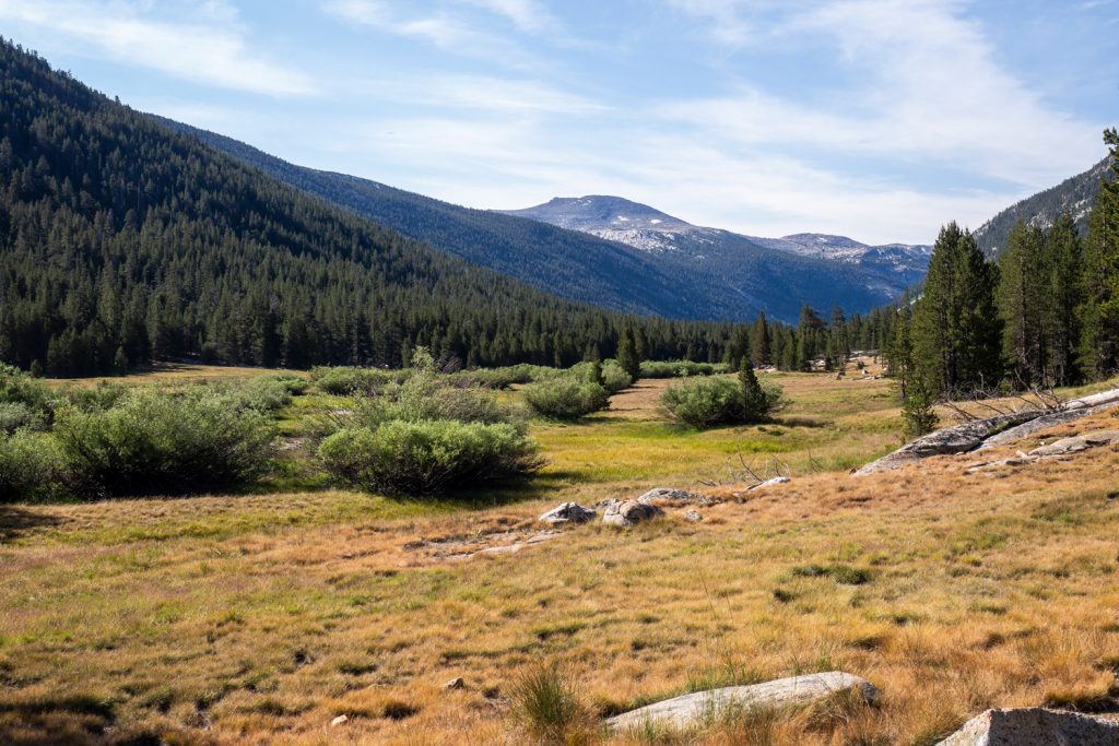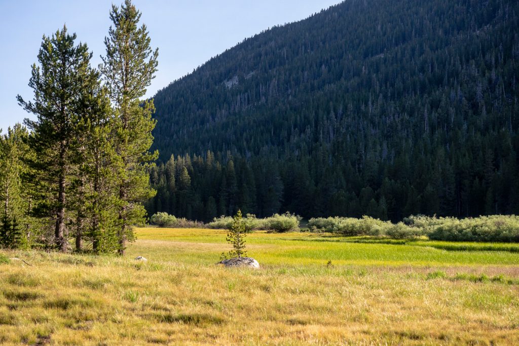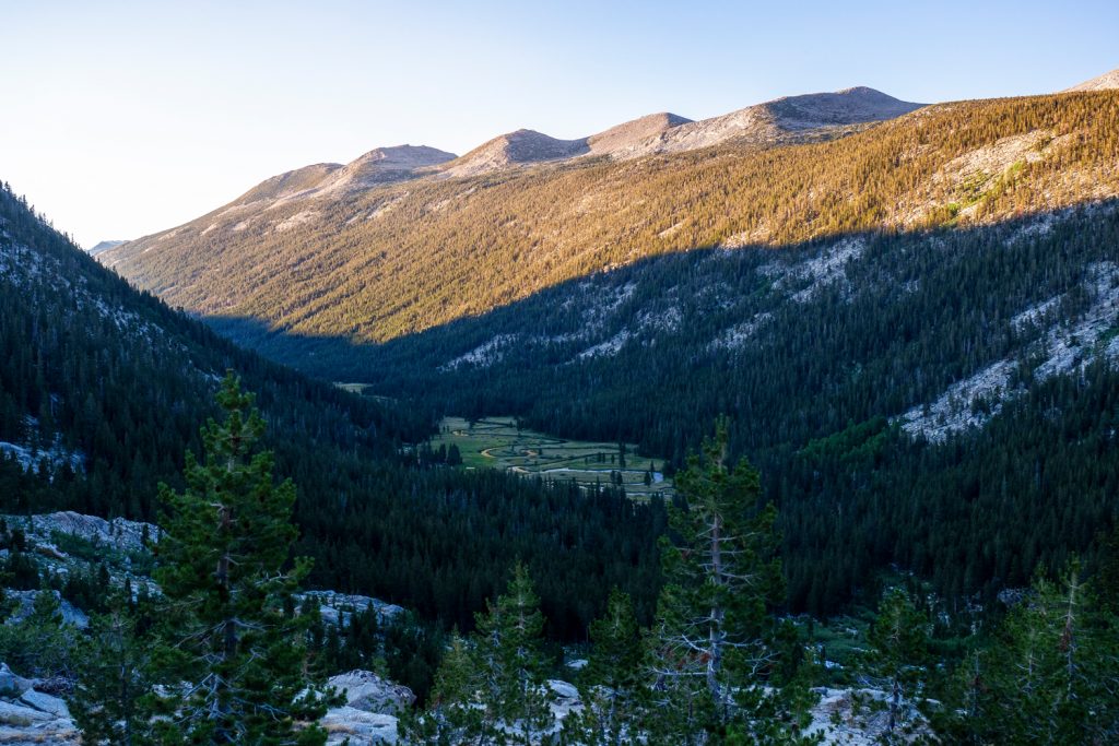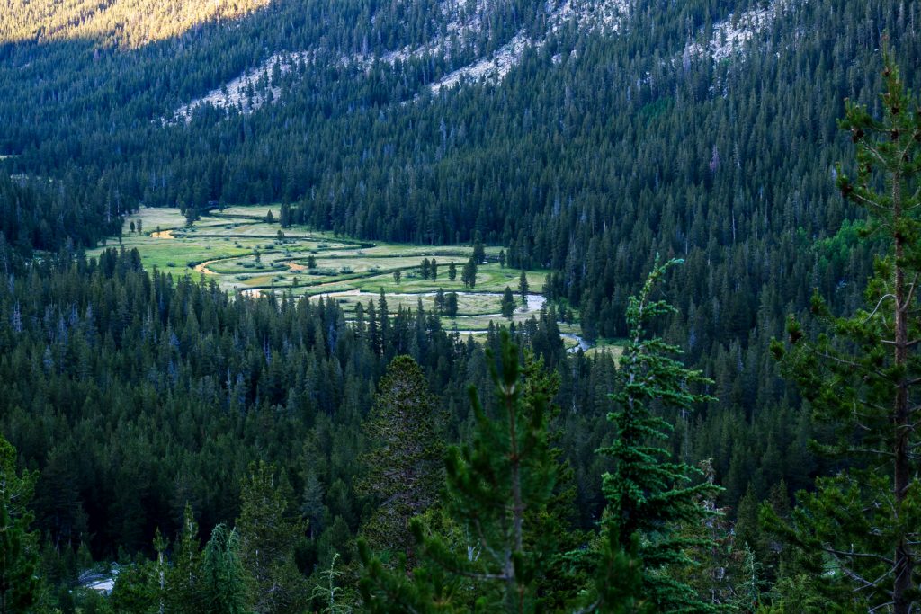 Der Abstieg in den Lyell Canyon ist nochmal ein Highlight! Natürlich spielt da das fantastische Licht mit, aber mich fasziniert auch die Sicht auf den wunderschönen Lyell Fork. Der Fluss mäandert so perfekt durch das Tal, ich muss lange stehen bleiben und schieße ca. 20 Fotos…