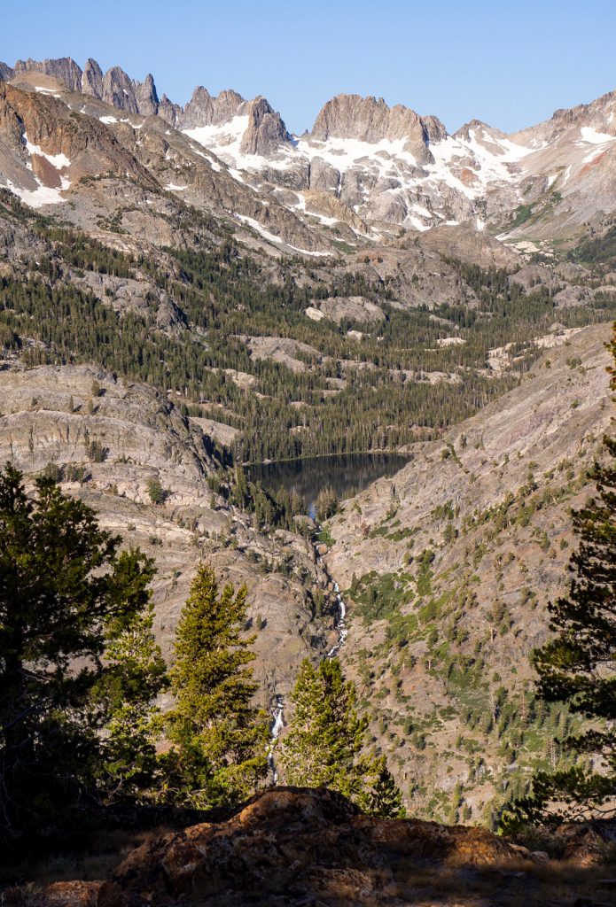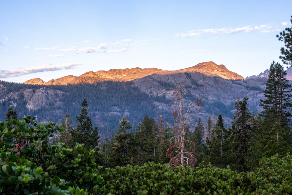 Ich komme heute richtig früh los und durch den Panoramaweg kann ich das schöne Alpenglühen an den Bergen im Tal gegenüber bewundern. Wir sind heute auf dem kurzen Stück unterwegs, an dem JMT und PCT unterschiedliche Wegführungen haben – der JMT führt auf der anderen Talseite an zahlreichen Seen vorbei. Wir hingegen können diese Seen von hier aus betrachten und man sieht, wie das Wasser über schöne Wasserfälle abfließt.