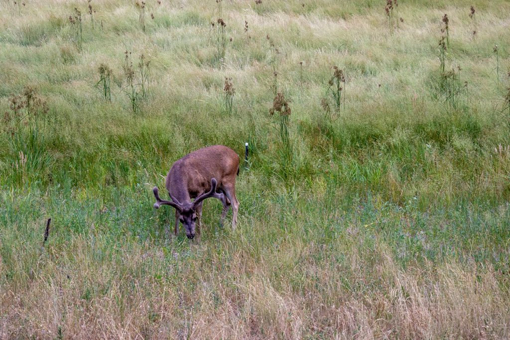 Der Trail beginnt spannend, es bleibt zwar waldig, aber wir wandern durch viel Stein und an Felswänden vorbei. Als ich Mel das nächste Mal einhole, deutet sie runter zum Fluss und ich sehe einen Hirschen, der uns aufmerksam beobachtet. Er ist sehr weit weg und auf meiner Kamera nur ein kleiner heller Punkt, doch Mel hat einen klasse Zoom und so kann ich den Hirsch auch „in groß“ sehen 🙂 .