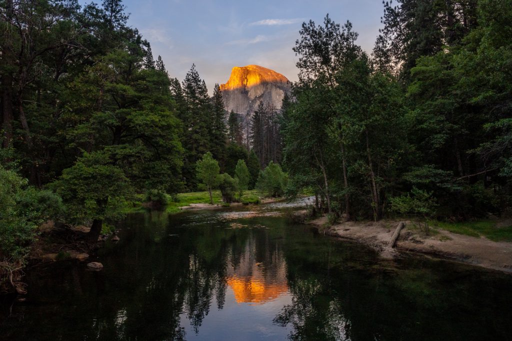 Es ist ein total schöner Abend mit der Gruppe. Wir stellen unsere Zelte (bzw. Schlafsäcke) wieder nah beieinander auf, baden im Fluss und gehen dann gemeinsam Tacos essen. Später versammeln wir uns bei der Sentinel Bridge um den Sonnenuntergang auf dem Half Dome zu bewundern und schaffen es dann tatsächlich, uns auf dem Campground auf der Suche nach der Abzweigung zum Backpackers Campground zu verlaufen. Ich sag ja, der ist ziemlich versteckt 😉 .