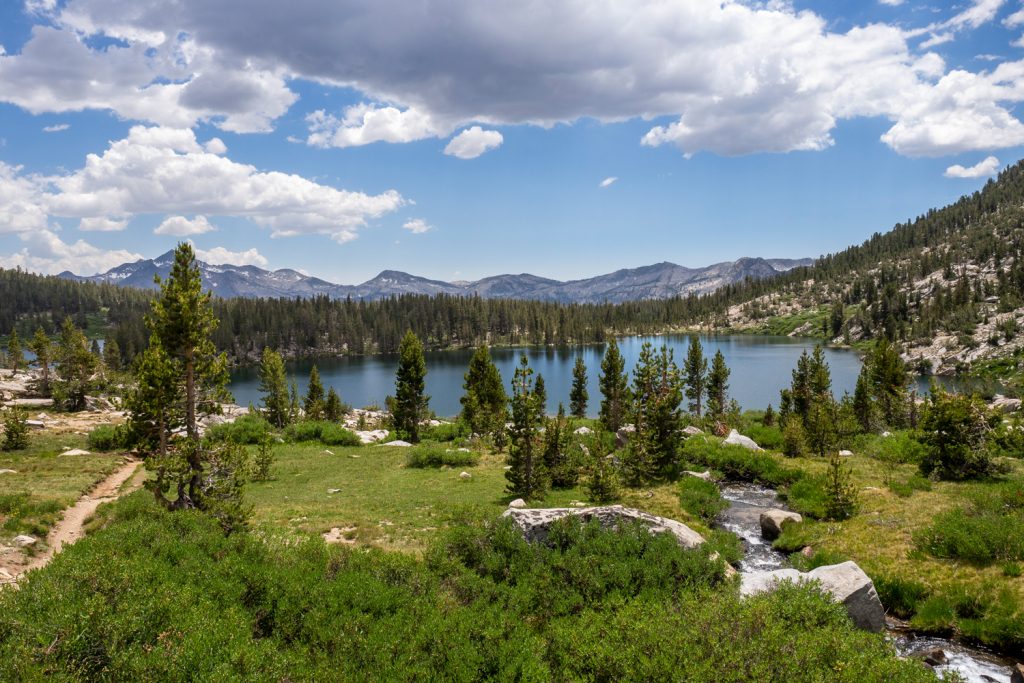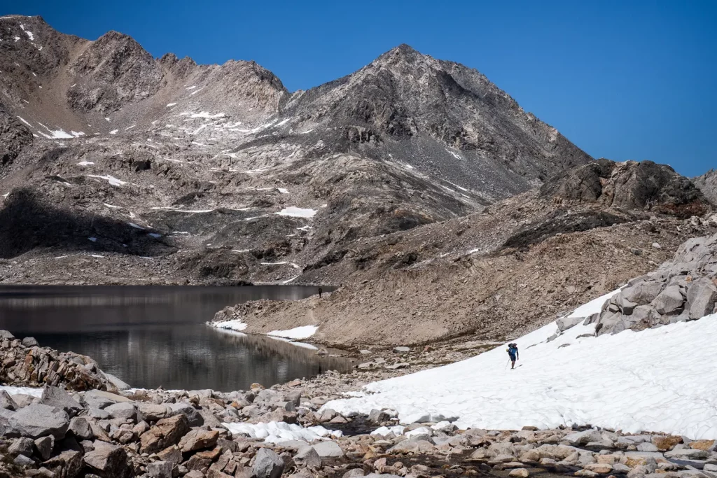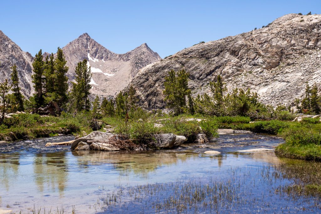 Der John Muir Trail im Herzen der Sierra Nevada: Auf Etappe 3 meiner PCT-Wanderung verlasse ich den Kearsarge Pass und tauche tief ins Hochgebirge ein. Wasser gibt es hier in Hülle und Fülle, zahlreiche Schmelzbäche fließen die Berghänge hinab und auf den Pässen liegt oft noch Schnee. Karger Steinlandschaft bei den Pässen und grüne Wäldern in den Tälern: das ist der JMT zwischen Kearsarge Pass und Vermillion Valley Resort.