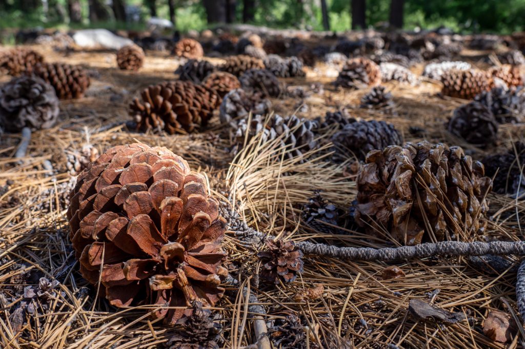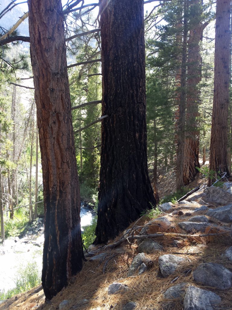 Rechts: Sequoias mit angekokelter Rinde, die allerdings noch relativ klein sind. Man erkennt sie an der Struktur der Rinde und den riesigen Zapfen am Boden.