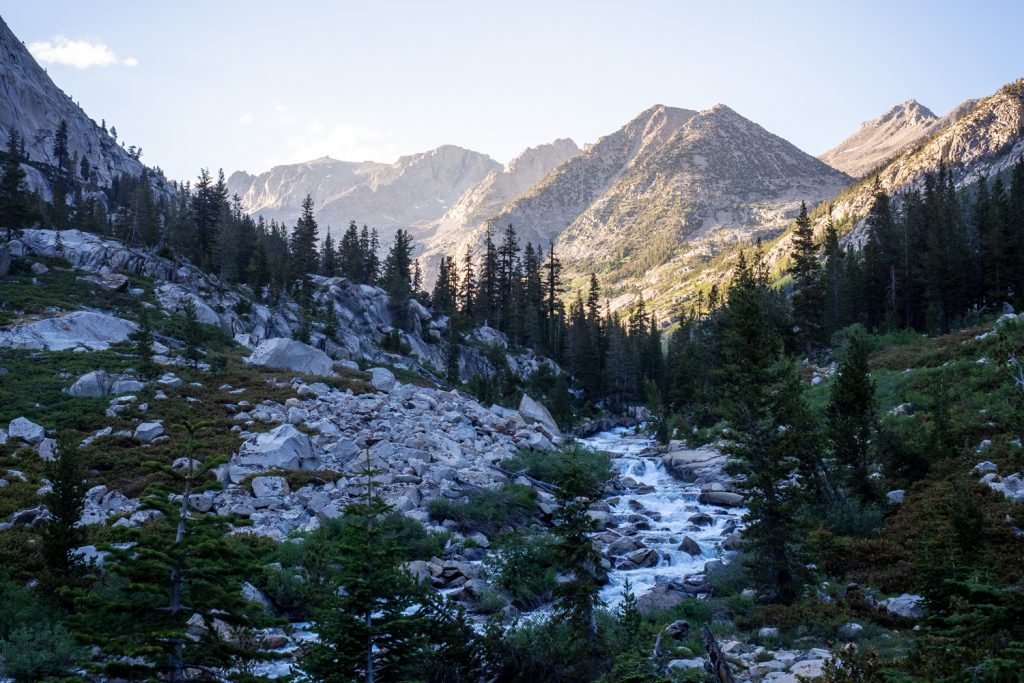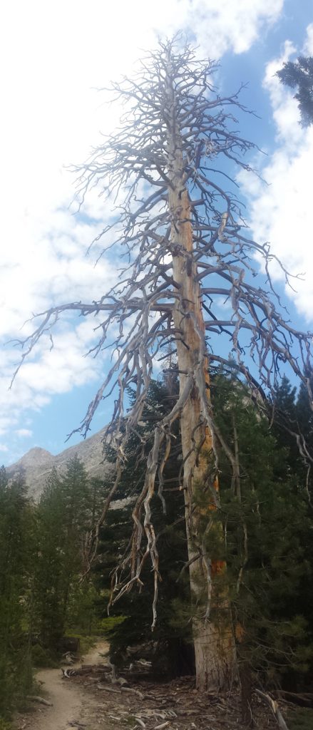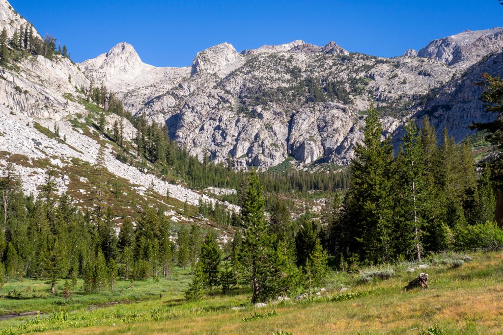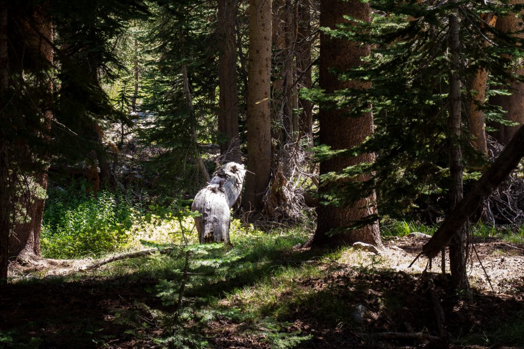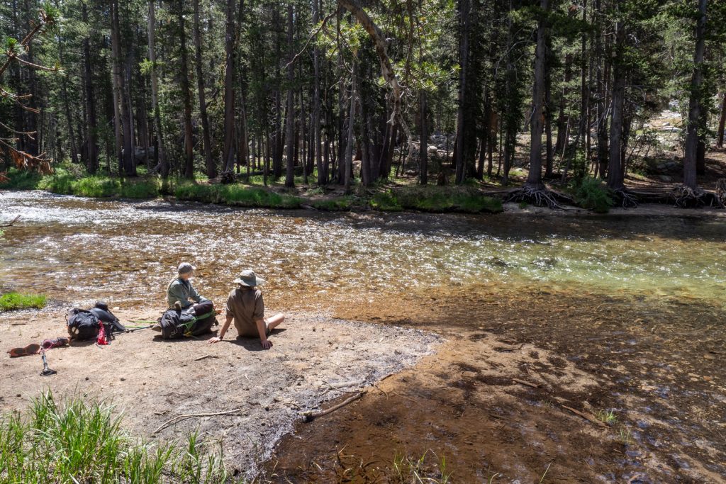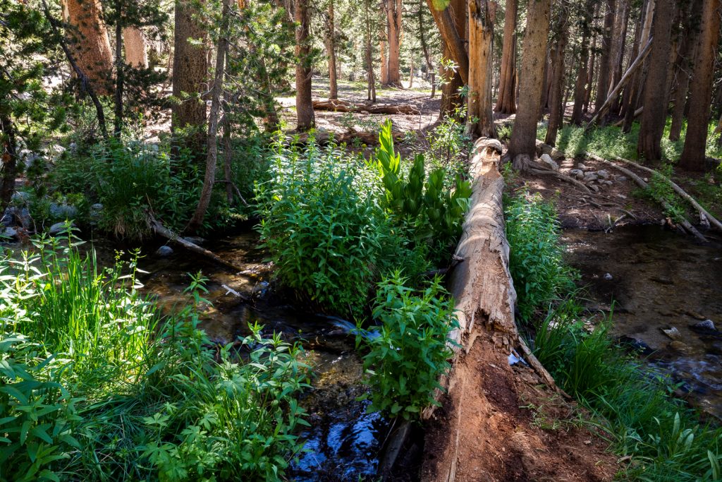 Die Pässe markieren ab jetzt keine dramatischen Klimaveränderungen mehr, wie das beim Forester Pass und auch beim Kearsarge Pass der Fall war. Für ein so hohes Gebirge ist es für mich allerdings überraschend, wie hoch die Baumgrenze liegt. Ich bin die spärliche Vegetation der Alpen gewohnt, doch in der Sierra Nevada läuft man locker 50% der Zeit unter hohen Bäumen (mit tausenden Mücken). Da mich diese Passagen eher stören und nerven, habe ich sie kaum fotografiert. Doch lasst euch von den Fotos dieses Beitrages nicht täuschen. Es sind wirklich 50% Wald!