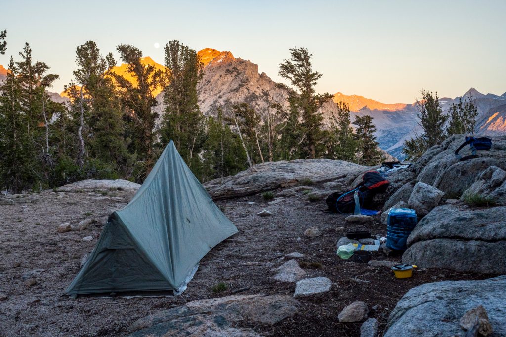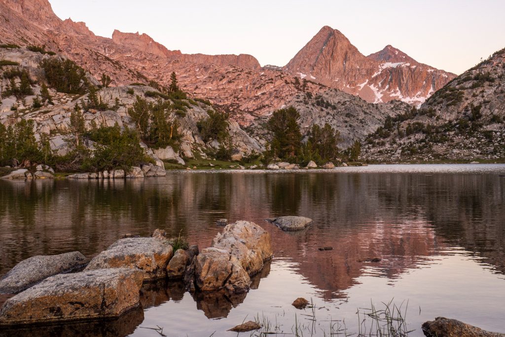 Obwohl ich vor Hunger fast vom Fleisch falle, muss ich immer wieder den See im Abendlicht fotografieren. Schließlich komme ich zu einem perfekten Campground, kurz bevor es von der Evolution Basin steil ins Evolution Valley hinabgeht. Hier liegen schon die Schlafsäcke von ein paar anderen Wanderern und ich geselle mich zu ihnen, koche mein Wasser und brühe mir mein Pad Thai auf, worauf ich mich schon lange freue. Danach sehe ich, dass es 30 min ziehen muss. 30 Minuten!! Halte ich noch so lange aus? Ich bin kurz verzweifelt, aber dann sehe ich, was der Sonnenuntergang mit der Landschaft anstellt und ziehe los auf eine kleine Fototour:
