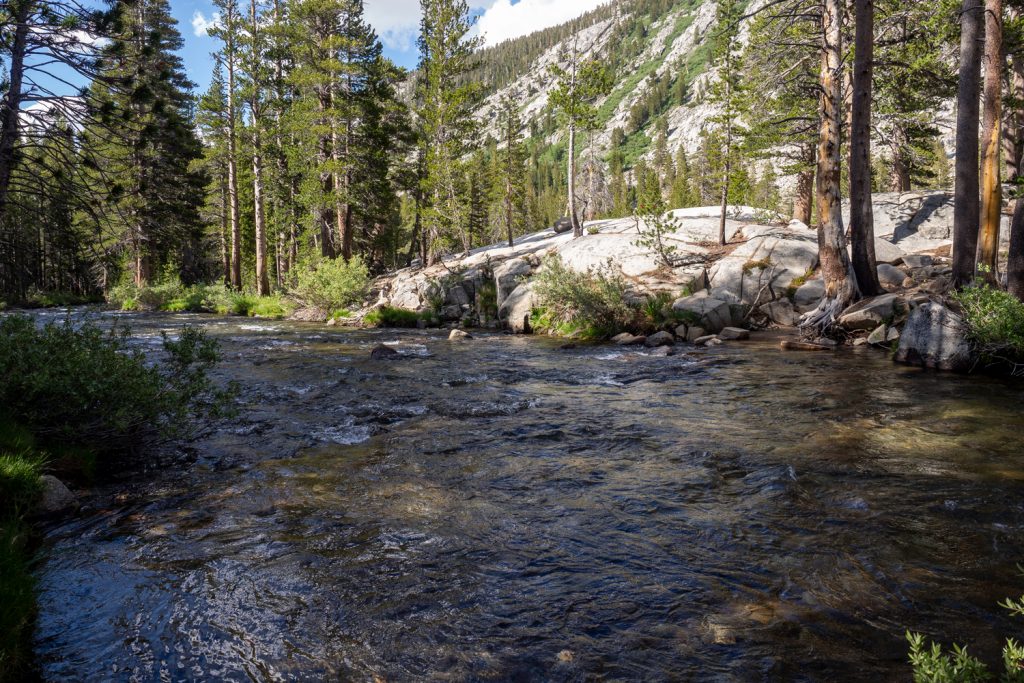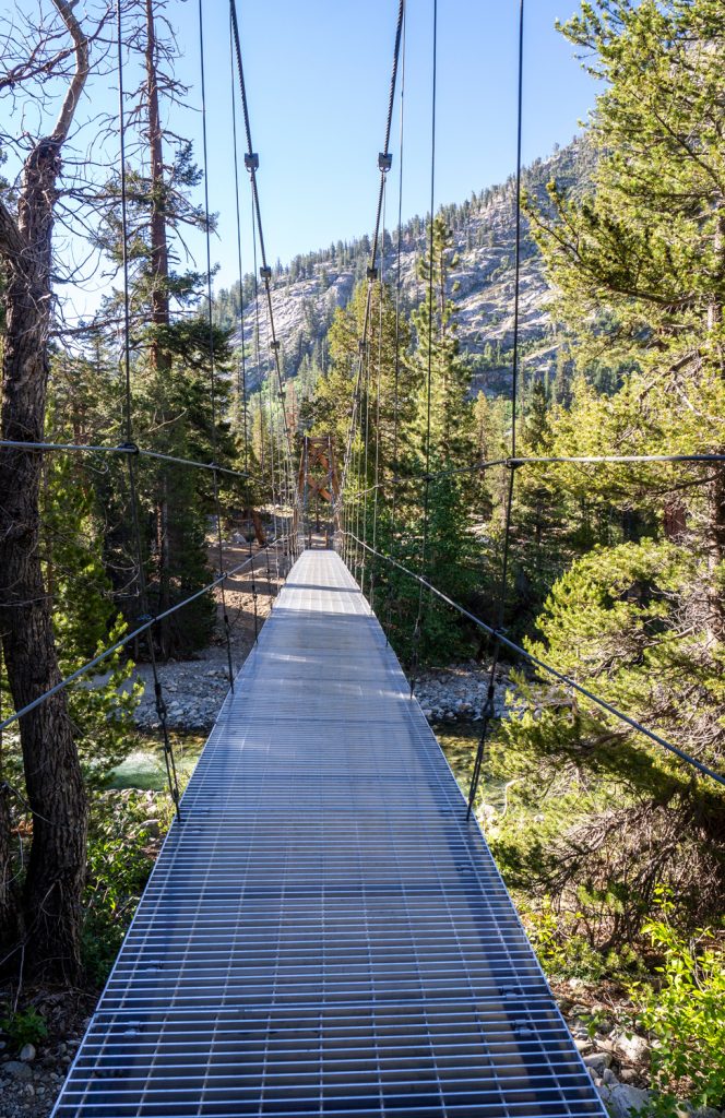 Bald danach führt der Weg über und am South Fork San Joaquin River entlang, einem sehr großen und wilden Fluss. Über ihn führen einige Brücken, unter anderem an der Grenze vom Kings Canyon National Park zur John Muir Wilderness.