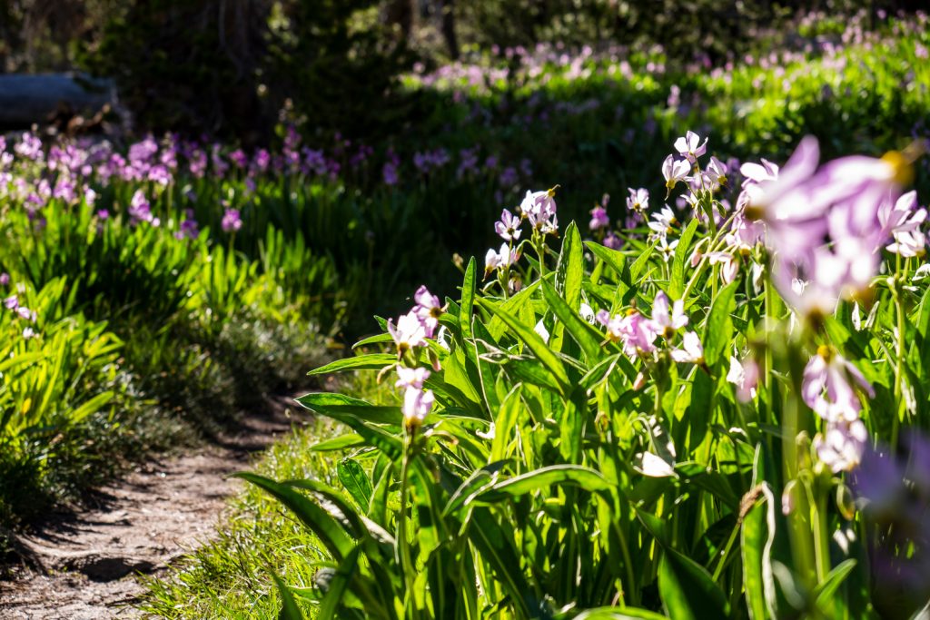 Ich bin mittlerweile schon ziemlich müde, ich hatte heute keine richtige Mittagspause und gehe auf 30 gelaufene Kilometer zu. Zwar gab es heute keinen Pass zu bewältigen, doch mit 600 Höhenmetern war es nun auch nicht gerade eine entspannende Etappe. Wie ich mich so den Berg Schritt für Schritt hochschleppe, beschert mir der Trail mal wieder einen magischen Augenblick: Das Licht taucht die am Wegesrand blühenden Blumen in wunderschönes warmes Licht, die Landschaft liegt friedlich und still da, keine Mücken weit und breit. Ich bleibe stehen und bin überwältigt von der Stimmung hier, von der Landschaft, von dem Licht, und die Strapazen sind für einige Momente vergessen.