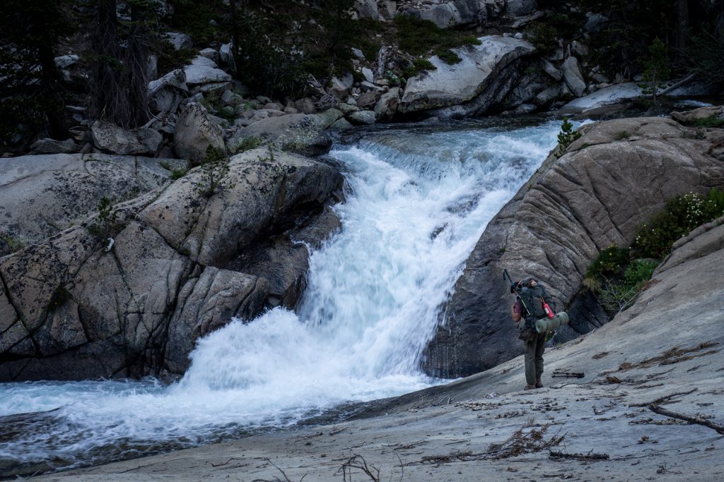 Zum Pinchot Pass geht es knapp 1100m auf 11,5km bergauf. Anfangs geht es spannend am Woods Creek entlang, ein mächtiger Fluss, der den harten Granitfelsen formt. Besonders beeindruckend finde ich den Woods Creek Waterslide, an dem der Trail direkt vorbei führt. Man läuft auf dem glattpolierten Granit und nebendran rauscht und rutscht das Wasser vorbei – garniert ist das mit einer tollen Aussicht in das Tal, aus dem ich gestern abgestiegen bin.