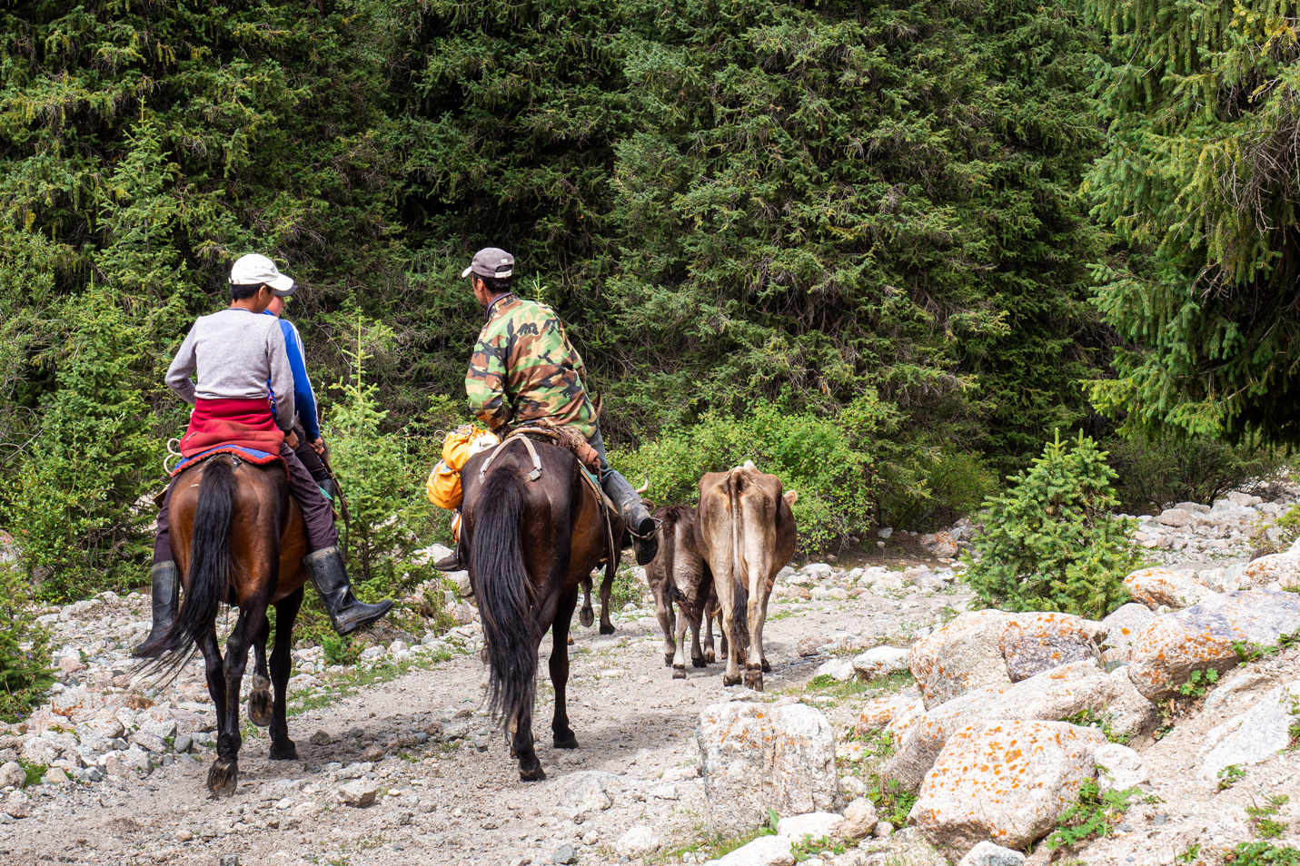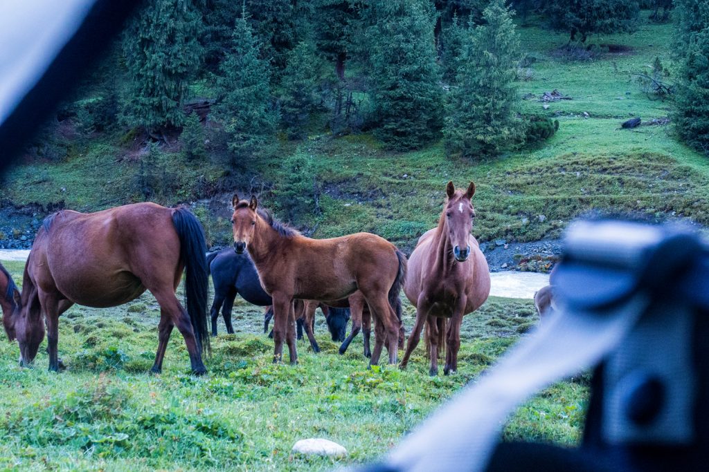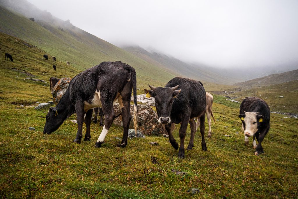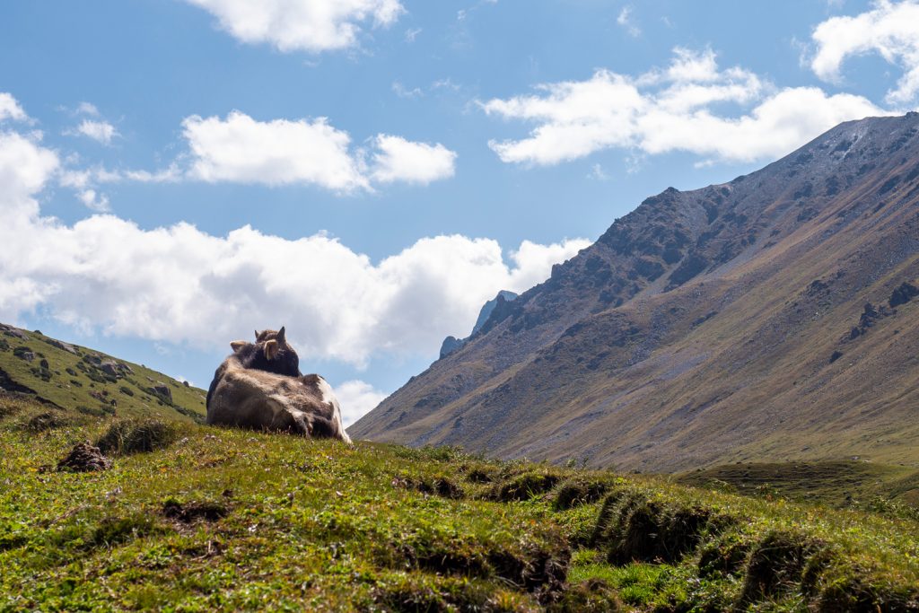 In den Bergen nahe des Issyk Köl Sees leben viele Hirten, die im Sommer ihre Kuh-, Pferde und Schafherden in den Tälern frei weiden lassen. Es vergeht dadurch kein Tag ohne Kuh- oder Pferdebegegnung.