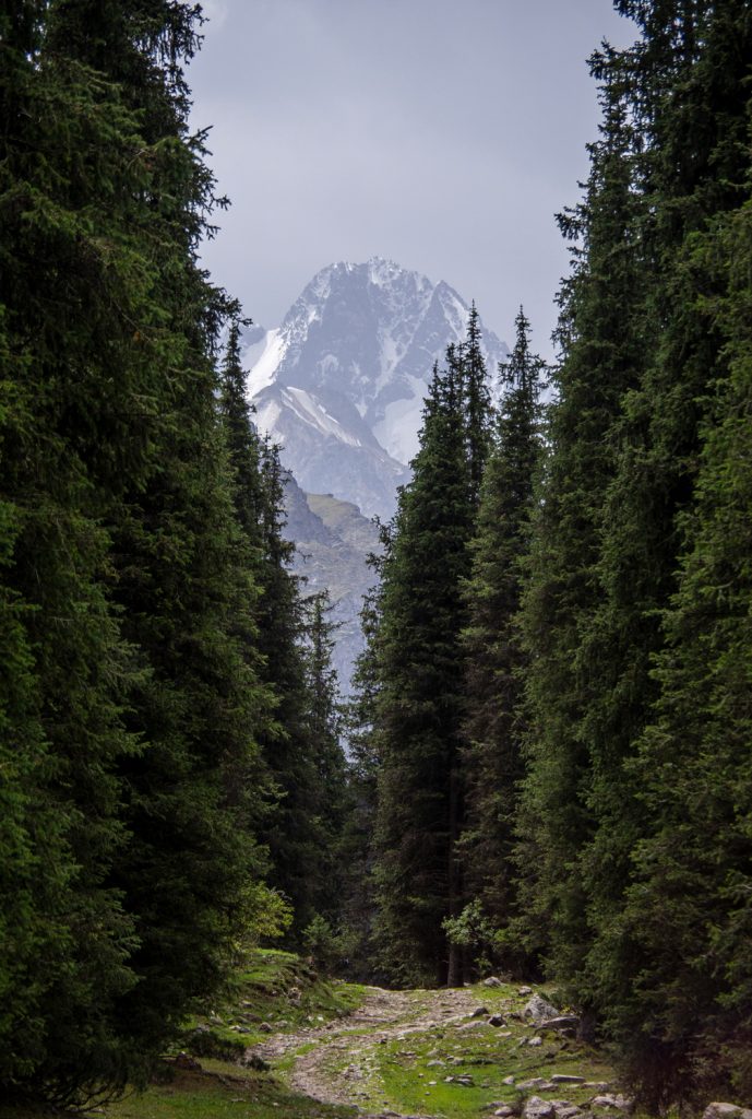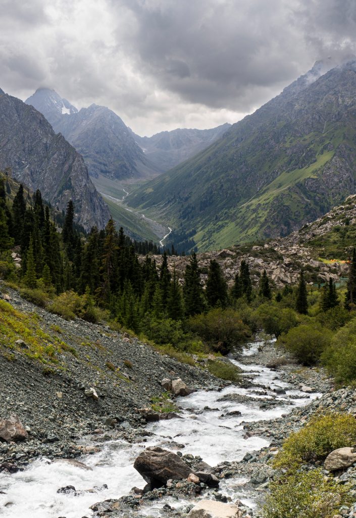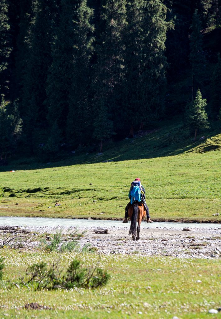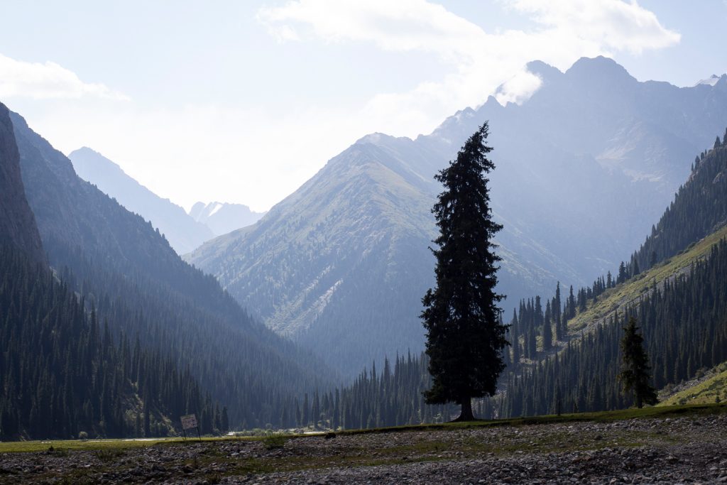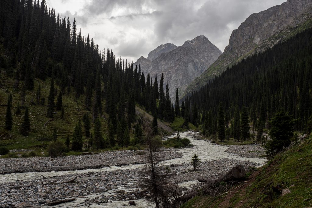 Am letzten Tag der Terskej-Alatau-Traverse wartet noch ein langer und zäher Abstieg durch das Ak-Suu-Tal. Ist das obere Tal noch schön und wild, zieht sich der Schluss auf breiten Feldwegen durch Tannenwald.