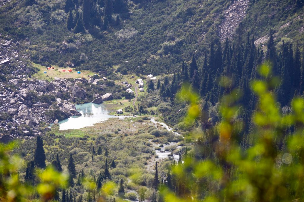 Schon kurz nach unserem Aufbruch laufen wir an der Zeltstelle zweier Trekker vorbei und verquatschen uns total: Eri und Daniela kommen aus der Schweiz, haben ihre Tour in Jyrgalan gestartet und sind einfach unglaublich nett.