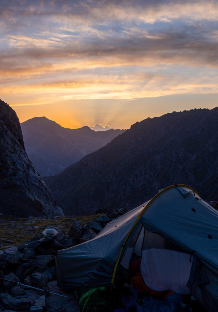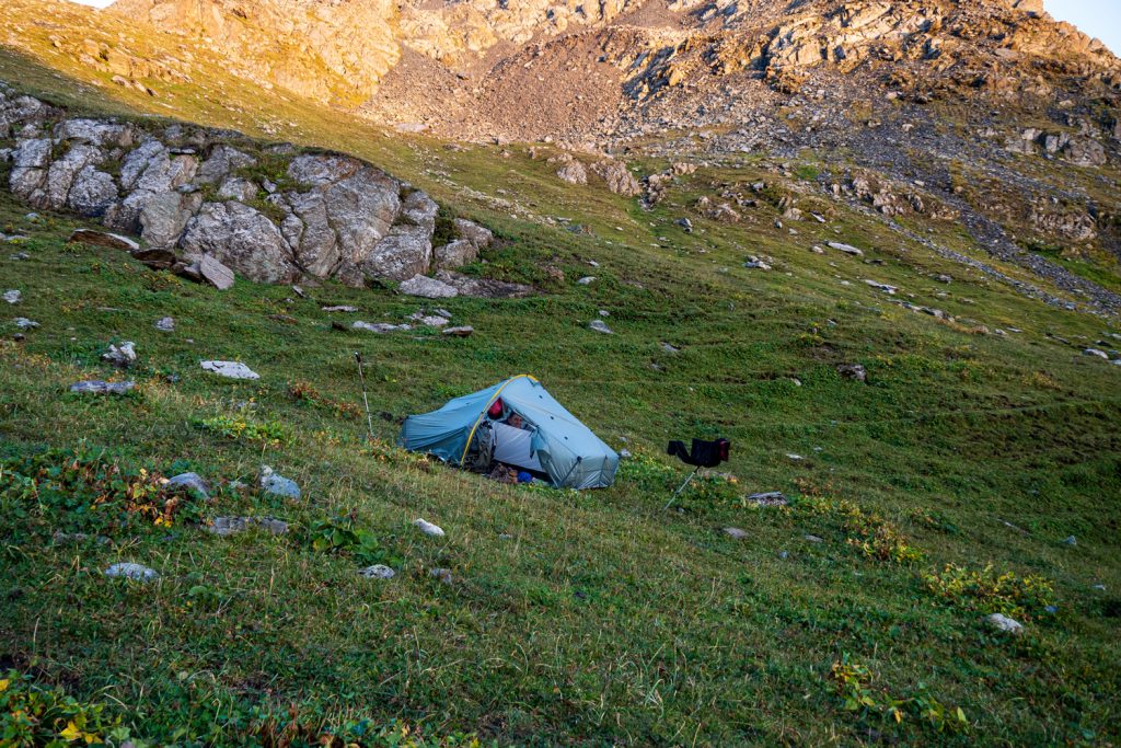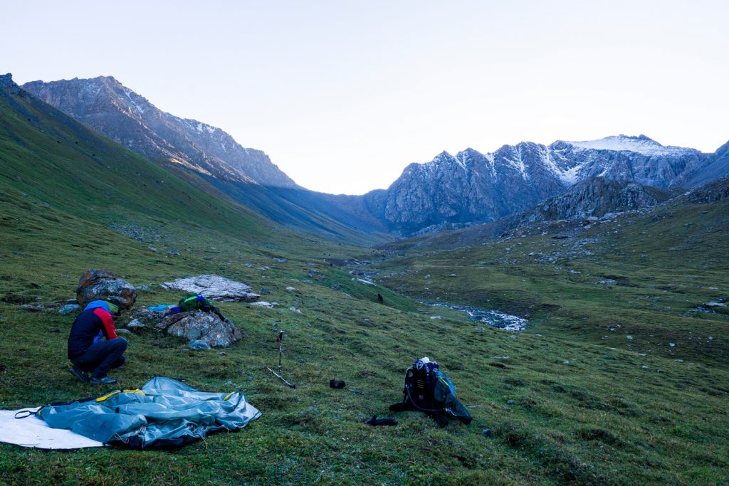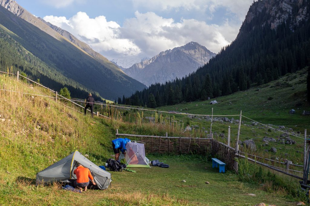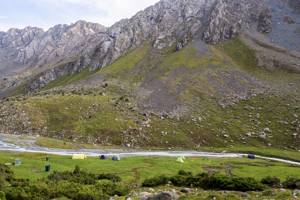 Nach ca. 4 h schlagen wir beim Zusammefluss von Aschuu-Tor und Kotor (denen der Chong-Kyzyl-Suu-Fluss entspringt) auf ca. 2.830 m unser Zelt auf. In der Nähe gibt es einen kleinen Bach, aus dem wir unser Trinkwasser holen können.