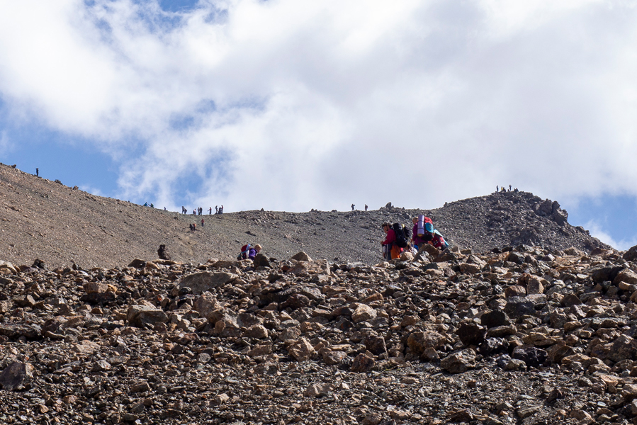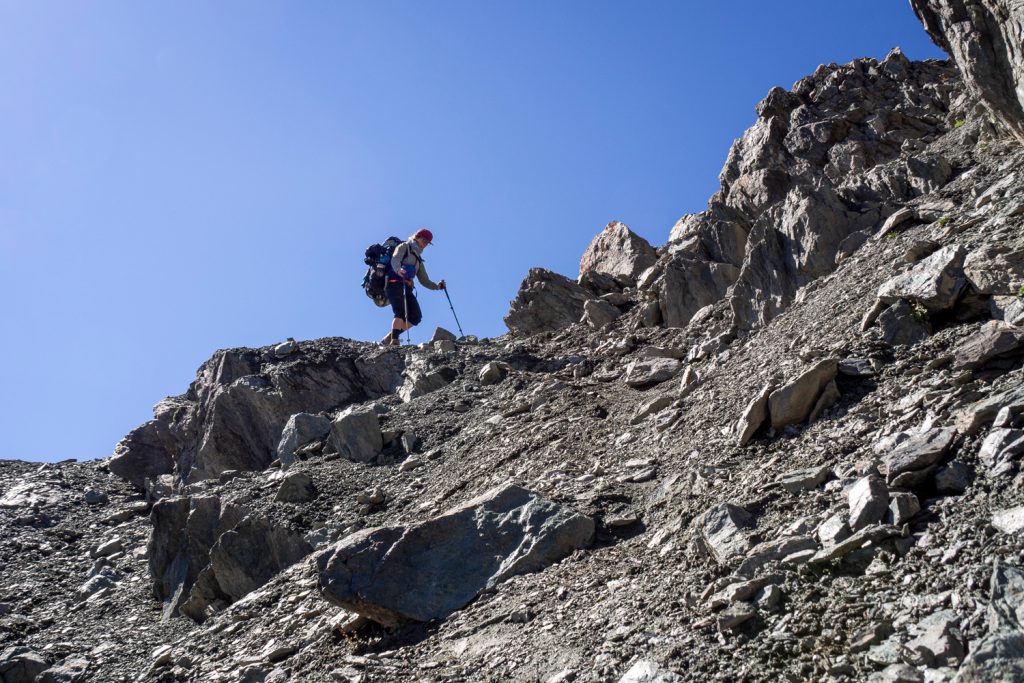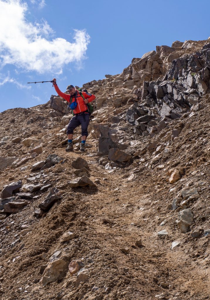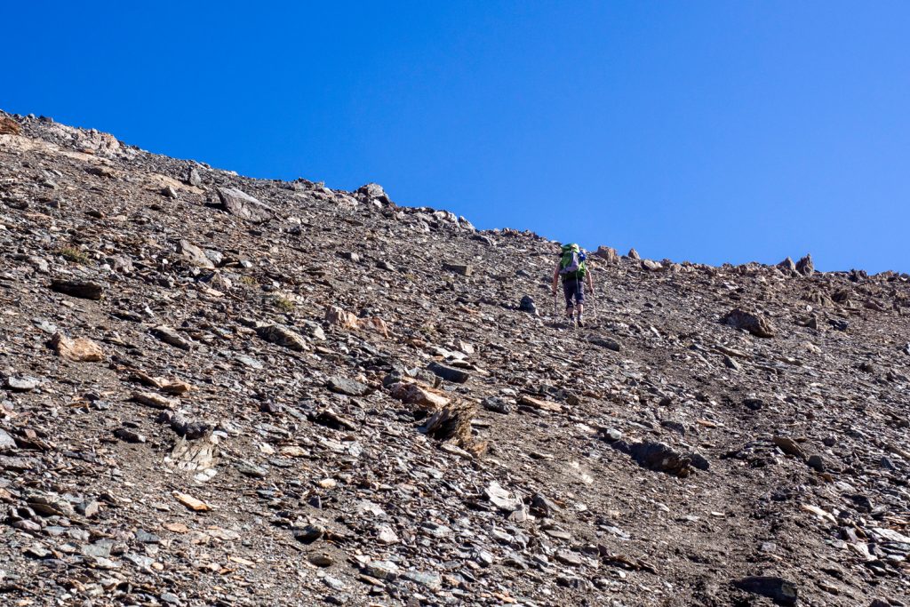 Der Aufstieg verläuft auf der rechten Seite des kleinen Flusses, man findet dann einen schwachen Pfad. Dieser führt bis zum Pass, das letzte Stück ist aufgrund des losen Untergrundes recht kräftezehrend.
