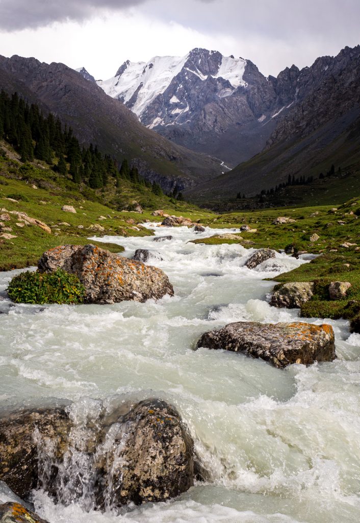 Im Chong Kyzyl Suu Tal geht es meist am mächtigen Gletscherfluss entlang, im Hintergrund sieht man das Kotor-Gletschermassiv