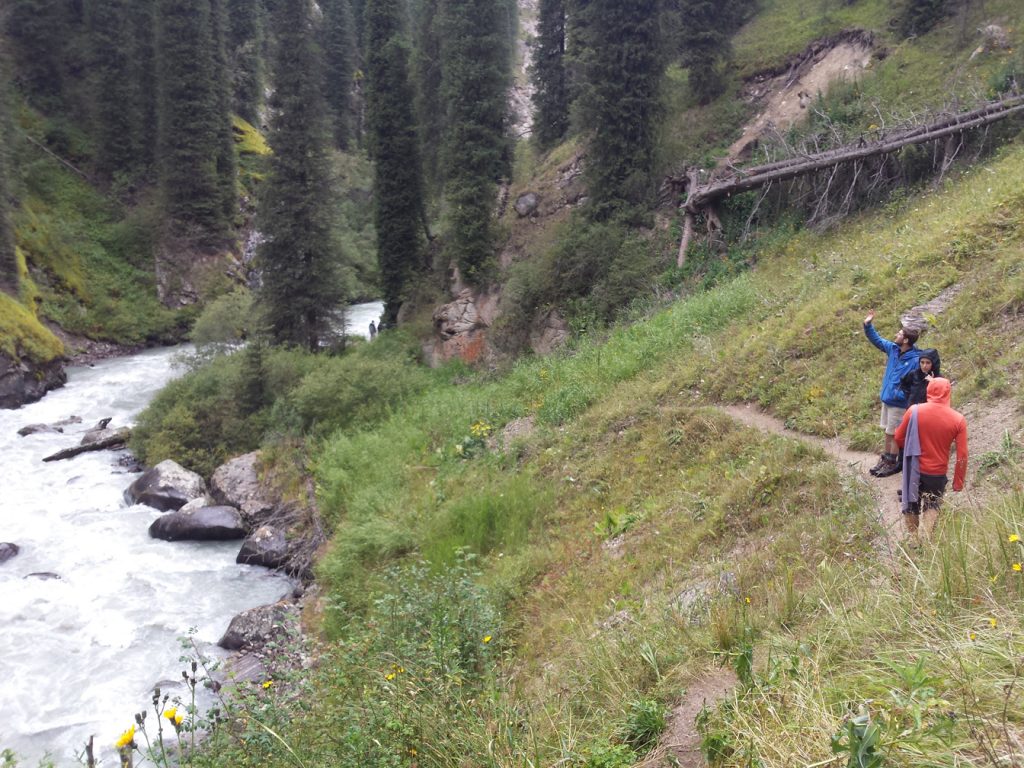 Der Weg verläuft zunächst unter mächtigen Tien-Shan-Tannen, einer nur hier vorkommenden endemischen Art. Nach ca. 1,5 h erreichen wir eine alte Wetterstation und der Blick kann nun das Tal entlang schweifen. Ein Auto überholt uns. Mitten auf der Wiese. Es ist ein ganz alter, normaler PKW und fährt hier, als wäre es eine normale Straße. Wir begegnen dem Auto etwas später wieder, die Besitzer haben es sich bei einem Stein mit Liegestuhl und Sonnenschirm bequem gemacht. Kirgisischer Sommerurlaub 🙂 .