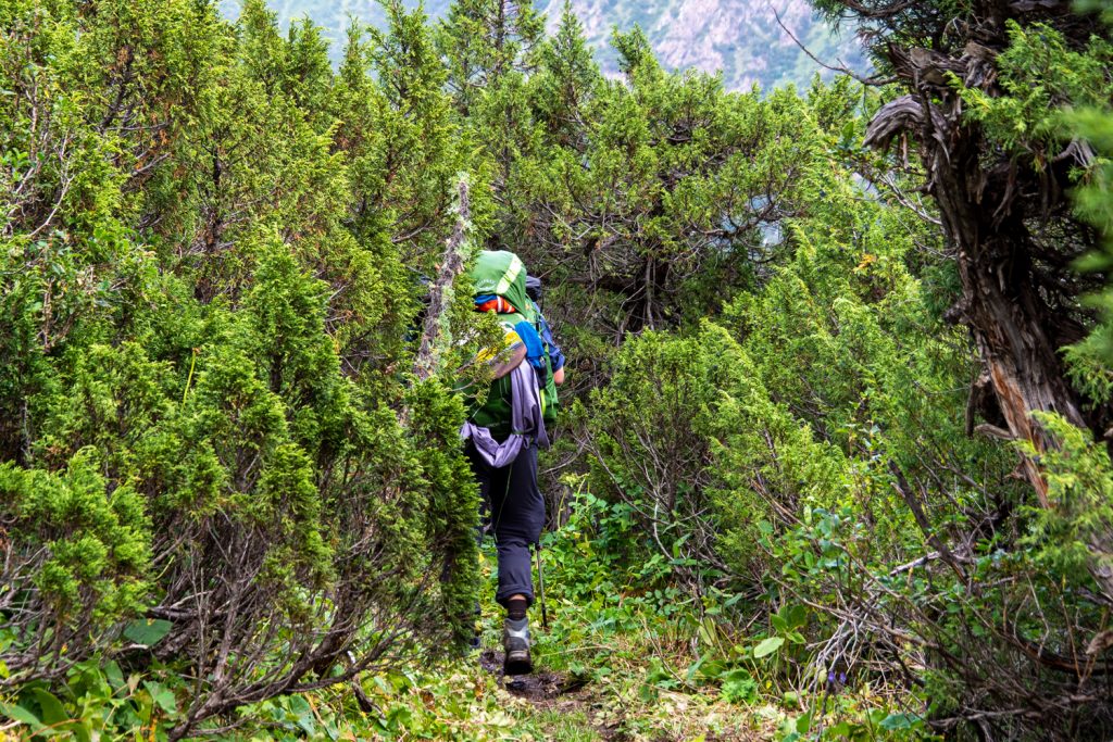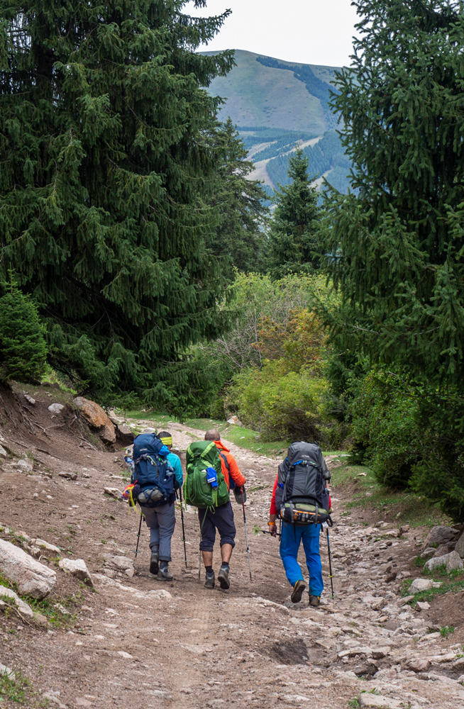 Die Entfernungen der Terskej-Alatau-Traverse erscheinen auf den ersten Blick recht wenig. Doch muss man beachten, dass man mit 11 Tagen Proviant startet und auch das Wasser auf weiten Strecken mitnehmen muss. So ist man die ersten Tage mit ca. 20-25 kg Gepäck unterwegs, was die Gesamtgehleistung natürlich um einiges mindert. Auch nicht zu verachten ist die Steilheit der Pfade, was zusätzlich Kraft kostet…