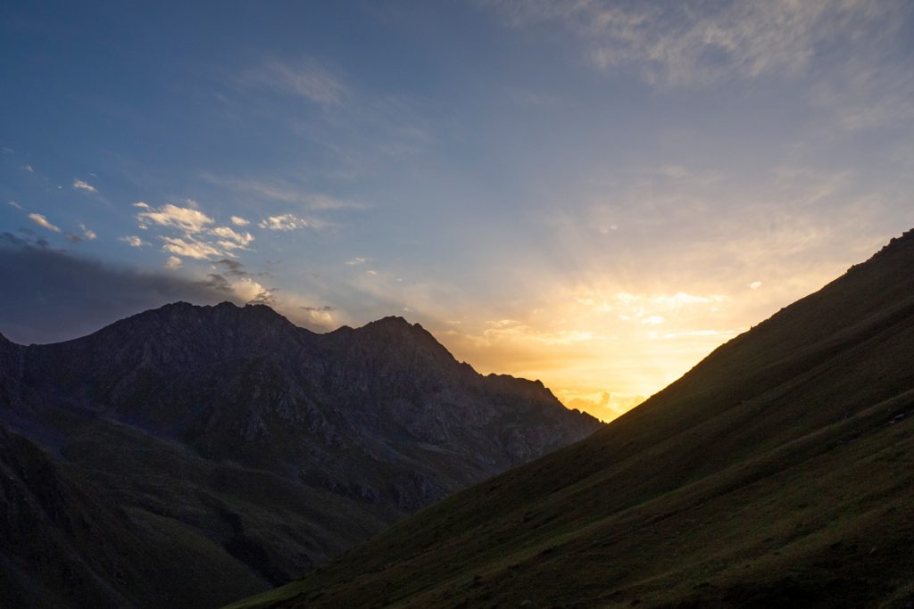 Der Terskej Alatau hingegeben beherbergt „nur“ Berge bis etwas über 5.000m und wird im Norden vom zweitgrößten Gebirgsee der Welt begrenzt, dem Yssykköl oder Issyk-Kul. Er ist relativ leicht zugänglich, hat gut zu begehende Pässe und eignet sich daher hervorragend für Trekkingtouren für Normalsterbliche. Durch die vielen zum See strebenden Täler kann man sich die Schwierigkeit und Länge seiner Tour individuell zusammenstellen. Die Traverse verläuft zwischen 2000 und 4000 Höhenmetern, man sollte sich also vor Start höhentechnisch akklimatisieren.