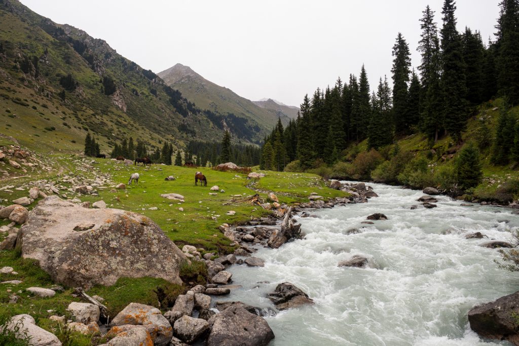 Wir sind in Bishkek einigen Franzosen begegnet, die die Berge etwas enttäuscht mit den (ihnen bekannten) französischen Alpen verglichen haben. Und ja, der Tian Shan ist ganz eindeutig ein Gebirge in einer ähnlichen Vegetationslage wie „unsere“ Alpen und hat dadurch gewisse Ähnlichkeiten. Doch es unterscheiden sich die Steine, die Pflanzen, die Bäume und die Form der Berge und Täler. Ganz zu schweigen von der faszinierenden Nomaden-Reiter-Kultur und der quasi nicht vorhandenen Infrastruktur in Form von Straßen, Berghütten oder Bergliften.