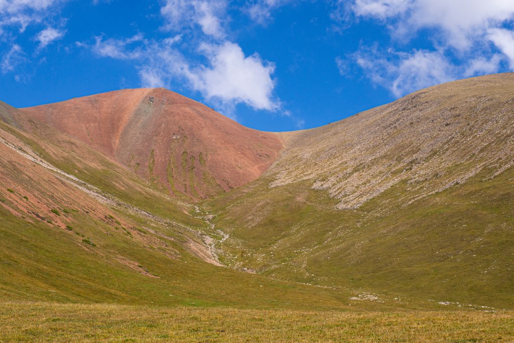 Den Aufstieg zum Pass findet ihr so: Auf der linken Talseite sticht ein roter Rücken ins Auge, der ins Tal hinab reicht. Hinter diesem Rücken versteckt sich ein kleines Tal, man kann einen Geländeeinschnitt zwischen einem felsigen Hang und einem Grashang ausmachen. Hier gehts bei einem ausgetrockneten Bachbett hoch.