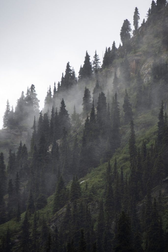 Wir folgen weiterhin dem Fluss auf der rechten Talseite, bis wir an eine Bergflanke gelangen, die im schäumenden Gletscherfluss endet: Es wird empfohlen, die Flanke möglichst hoch und möglichst weiträumig zu umgehen, und genau das tun wir. Anfangs finden wir noch einen sehr steilen, schmalen Reitpfad, der sich jedoch bald im Gestrüpp der dichten Tannen verliert. Immer wieder müssen wir neue Pfade finden, es geht sehr steil hinauf und später sehr steil wieder hinunter. Es regnet, alles ist nass und schlammig, während wir durch den dichten Wald irren.