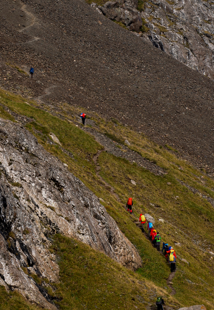 Insgesamt begegnet man wenigen Leuten – Ausnahme bilden die Etappen 7 und 8 über den Alaköl / Ala-Kol See und das „Dorf“ Altyn Araschan. Sie sind Teil eines beliebten 4-Tages-Trek, den fast jeder Kirgistan-Reisende erwandert. Man sollte sich bei diesen Etappen auf lange Schlangen von Reisegruppen einstellen, begleitet von jungen Trägern mit riesigen 30+ kg Rucksäcken und schlechter Ausrüstung. Landschaftlich ist dieser Abschnitt zwar durchaus ein Highlight der Terskej-Alatau-Traverse, mir war es aber deutlich zu überlaufen.