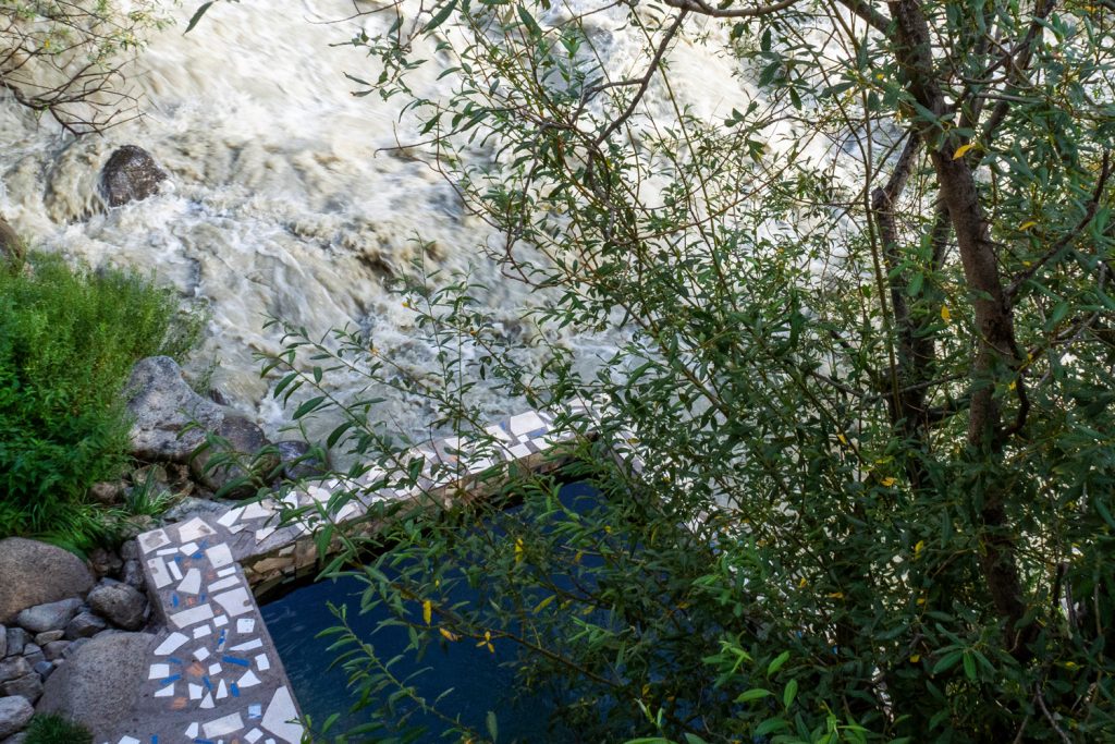 Es gibt drei Becken mit warmen Wasser, aber wir baden nur in dem äußeren, direkt neben dem schäumenden Gletscherfluss. Jeder Gast hat 30-60 min Zeit im Becken, es ist sehr heiß, länger hält man es eh kaum aus.
