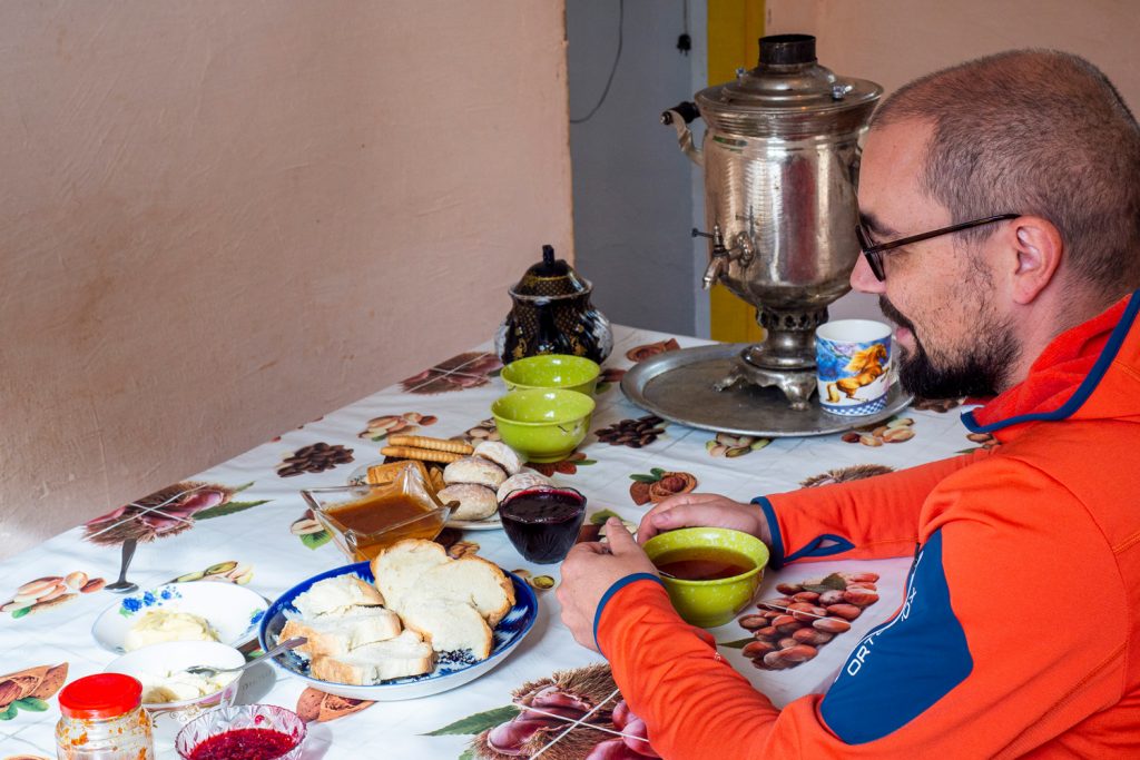 Nach einem unerwarteten und leckerem kirgisischen Frühstück starten wir mit unseren schweren Rucksäcken das Tal hinauf. Das „externe Frühstück“ hat den Inhalt leider auch nicht erleichtert und so haben wir immer noch fast 11 Tagesrationen Essen dabei.